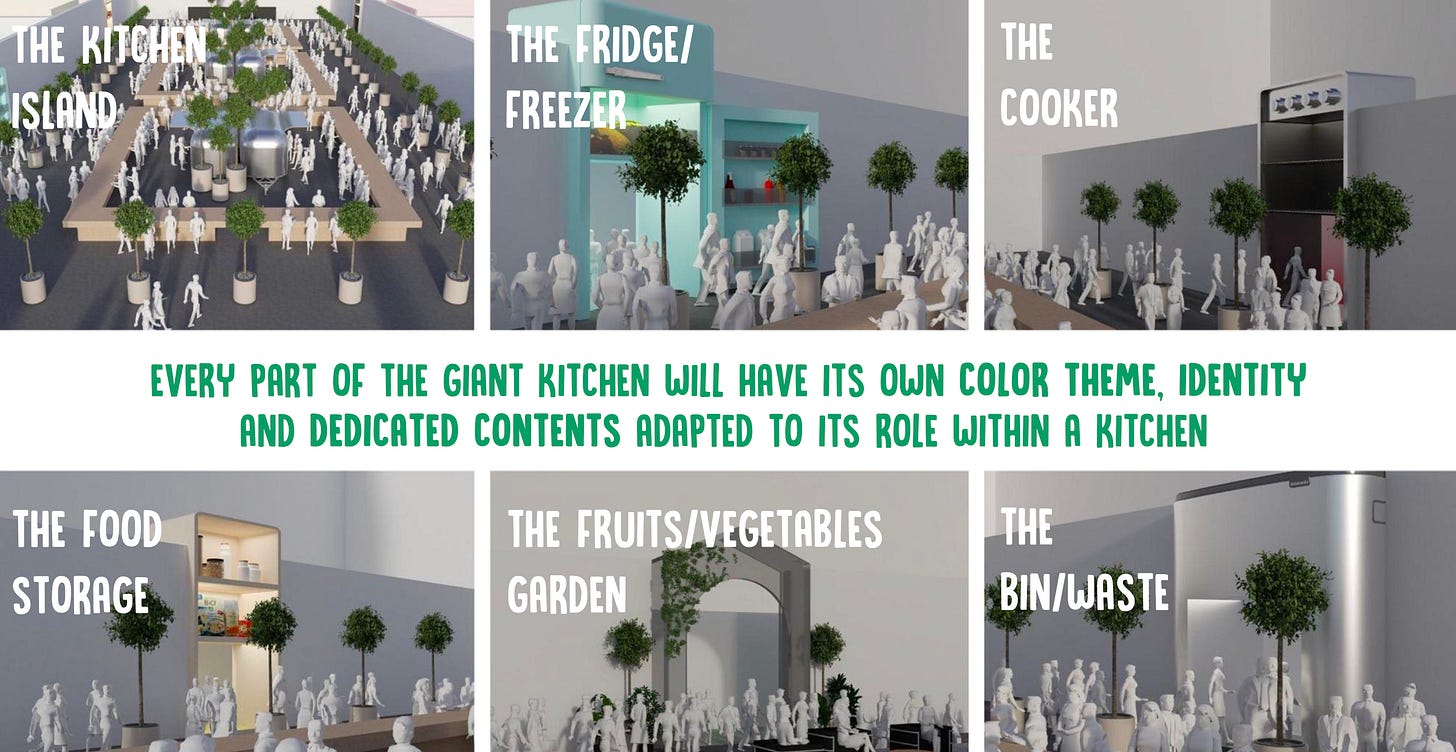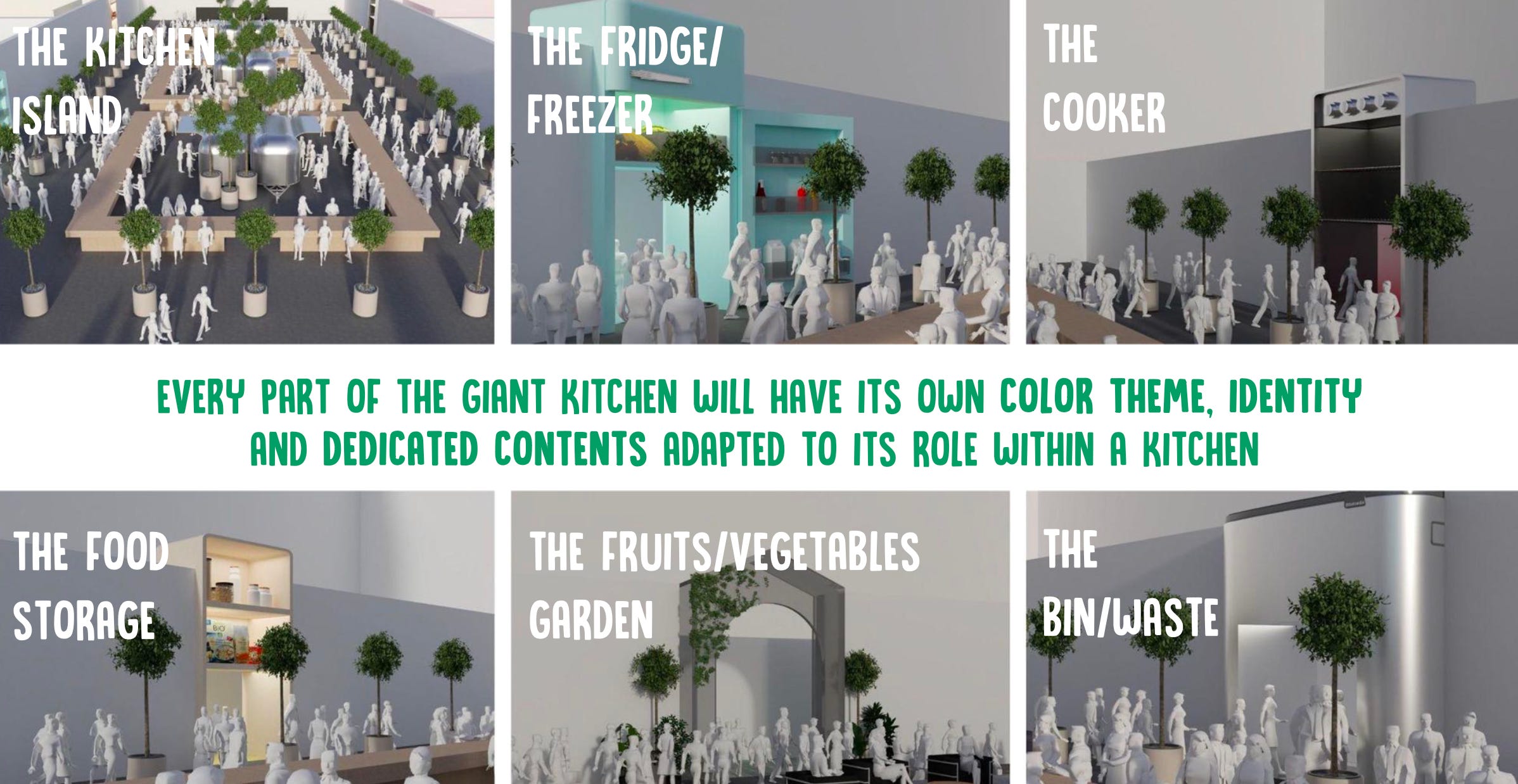 The event will take place over the 11,000m2 of Palais 3 at Brussels Expo. The space will be divided into six zones, which together represent a giant kitchen. You will find: the kitchen island, the fridge, the pantry, the garden (fruit and vegetables), the cooker and the dustbin.